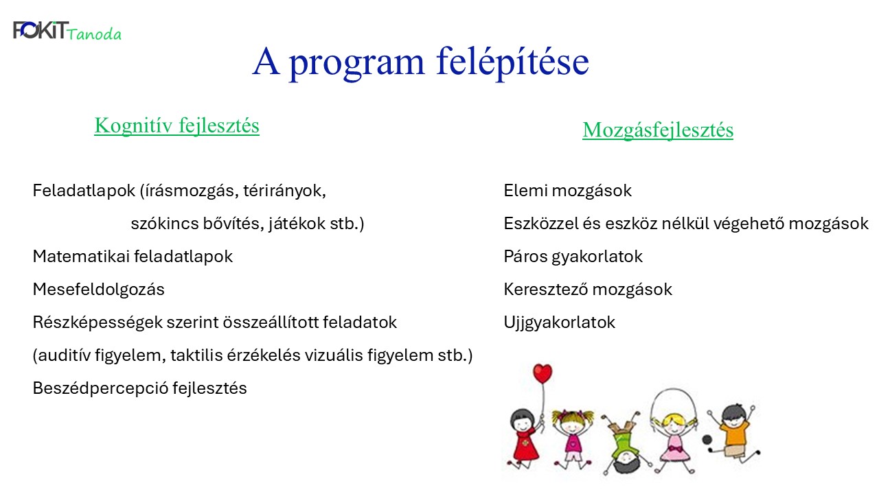A program, az olvasás, írás és számolás későbbi tanulását játékos, a gyermeke életkorának megfelelő módszerekkel készíti elő, fókuszálva a feladattudat, a feladattartás, monotónia tűrés a koncentrációs képességének, emlékezet, a szerialitás, a tájékozódás, a tájékozottság, a motoros képességek, orientációs képességek (téri, idői), vizuális és auditív észlelés, beszédészlelés fejlesztésére is, melyek az iskolaérettség előfeltételei közé tartoznak.