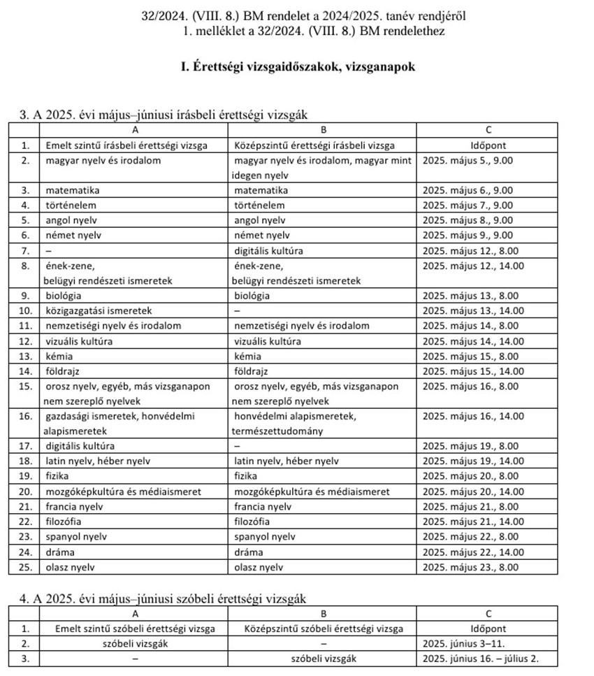 I. Érettségi vizsgaidőszakok, vizsganapok
